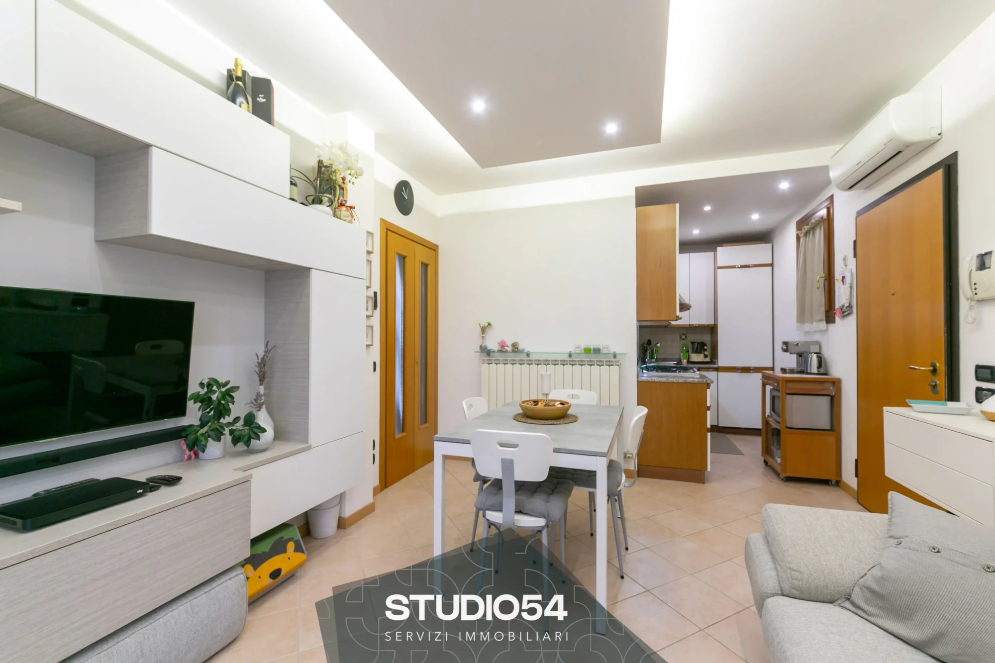 L’ingresso si apre su una luminosa zona giorno con cucina a vista. Da qui si accede direttamente all’ampio terrazzo, un ambiente conviviale perfetto da vivere ogni giorno.